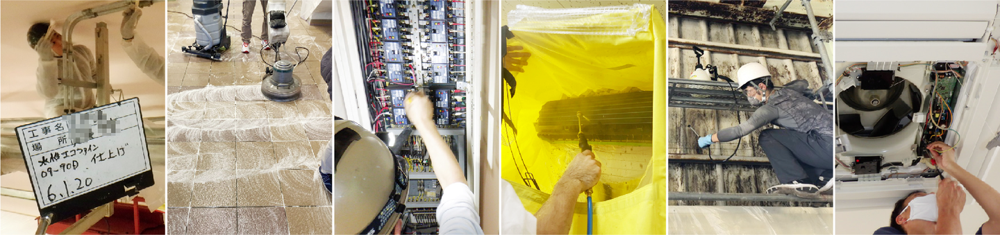 空調設備の点検・取り替え、雨漏り工事など、現在の柱のひとつである建物/設備の工事・保全業務のはじまりは、小さな修理や改修でした。また快適かつ衛生的な環境づくりのお手伝いは、防臭工事、防カビ工事などへと対象や範囲を広げています。